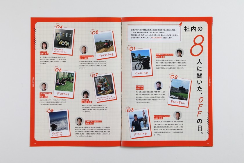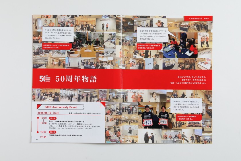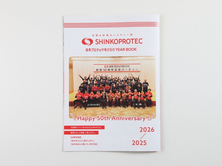 信幸プロテックでは、一年の会社の動きを紹介するイヤーブックを制作しています。今年制作したイヤーブックでは、今年5月に行われた「50周年イベント」の裏側を紹介しています。イベント当日の写真することに加え、このイベントの実現するために奮闘した社員3名のインタビューも実施し、記事として紹介しています。さらには、第二特集として、社員のオフの過ごし方なども紹介。仕事の紹介だけでなく、社員の人となりも伝わるものにしています。余談となりますが、この50周年事業については、開催に向けた社内会議にも出席させていただきました。社員の団結力をひしひしと感じるとともに、ライト・ア・ライトもこんな会社になっていきたいなと思わされました。